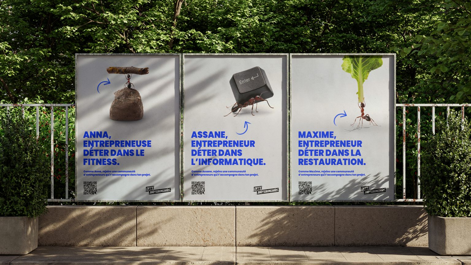 Et si une simple fourmi pouvait porter un rêve ? Sur chaque affiche, une fourmi avance, chargée d’un élément qui symbolise une ambition. Chacune représente un entrepreneur en devenir, en chemin, porté par la force du collectif. Une métaphore visuelle forte, pour inspirer et rappeler que, quel que soit le point de départ, la détermination ouvre la voie.