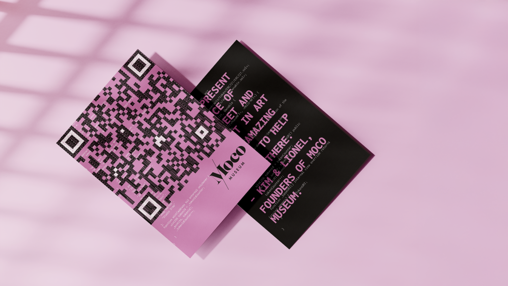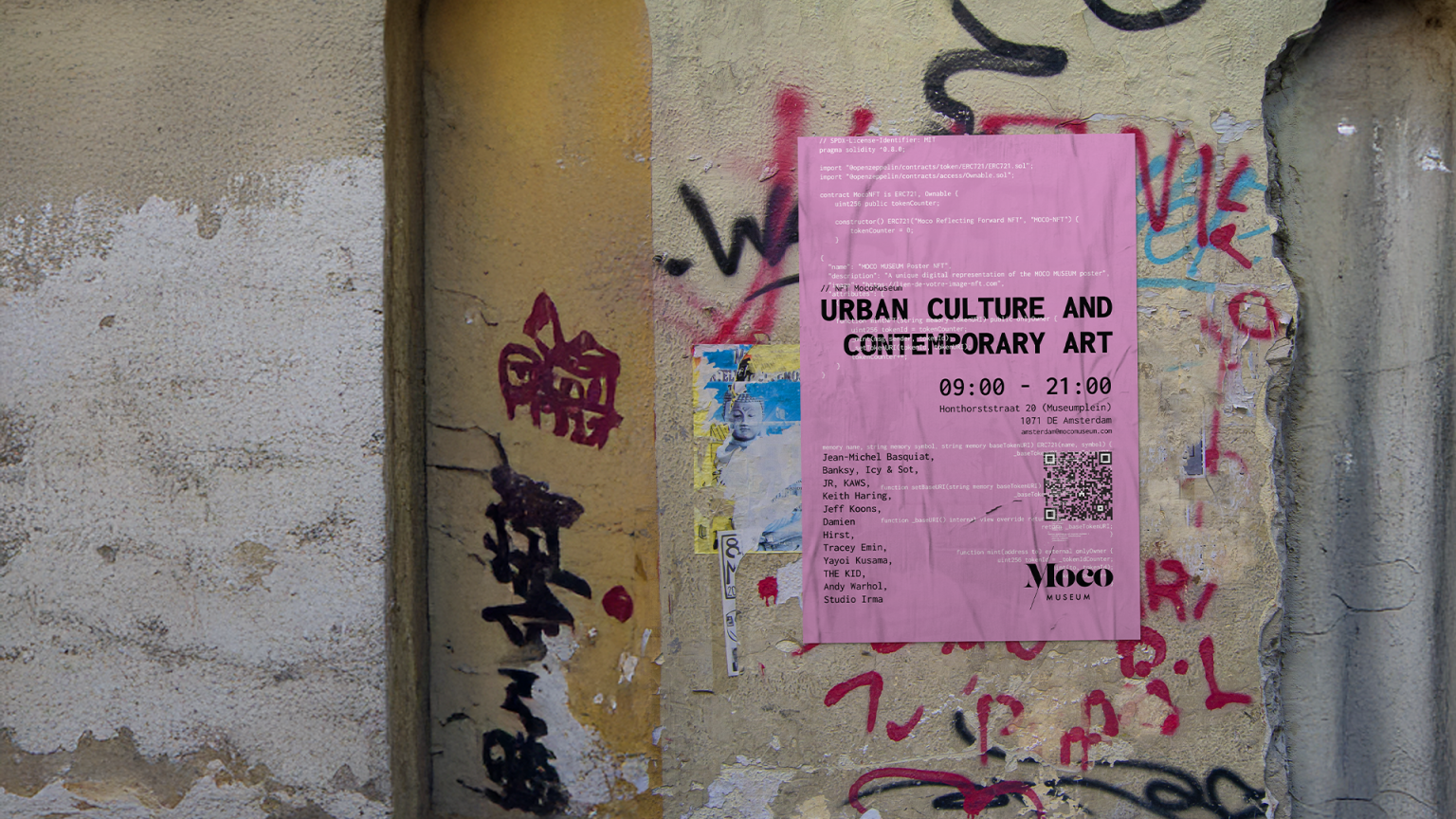 Et si l'art pouvait être à la fois numérique et physique ? Pour promouvoir l’NFT Experience du Moco Museum, j’ai créé une affiche NFT, intégrant son propre code NFT, fusionnant ainsi l'art et la technologie. La superposition du code avec le titre renvoie à l’esthétique urbaine contemporaine, qui joue sur la fusion des mondes physiques et numériques. Le QR code en gros plan sur le flyer invite le spectateur à interagir immédiatement avec le projet, utilisant son smartphone pour engager une expérience immersive et interactive.
